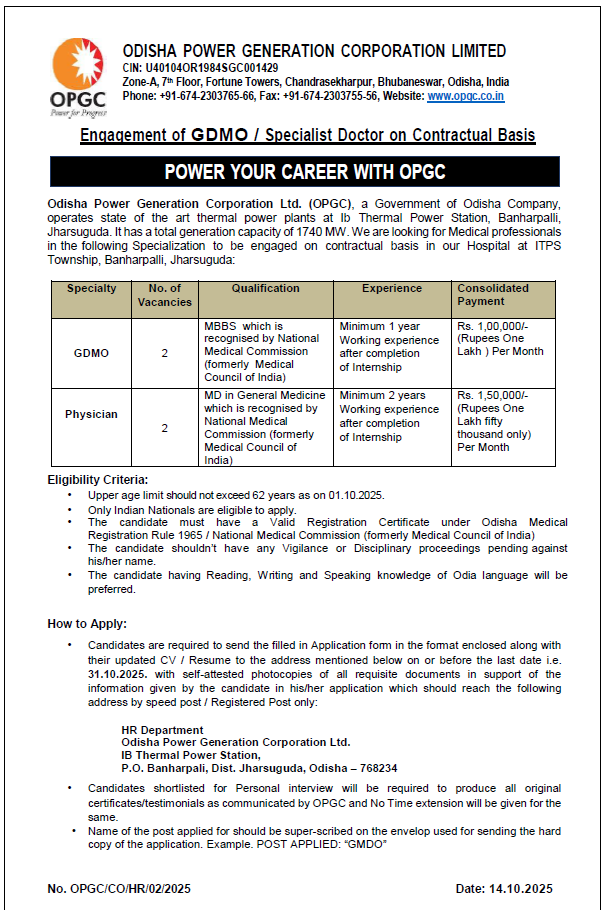 Odisha Power Generation Corporation Limited (OPGC), a Government of Odisha company, has released an official notification inviting applications for the engagement of General Duty Medical Officers (GDMO) and Specialist Doctors on a contractual basis.The recruitment aims to strengthen the healthcare facilities at IB Thermal Power Station (ITPS), Banharpalli, Jharsuguda, one of OPGC’s state-of-the-art power generation facilities with a total capacity of 1740 MW.