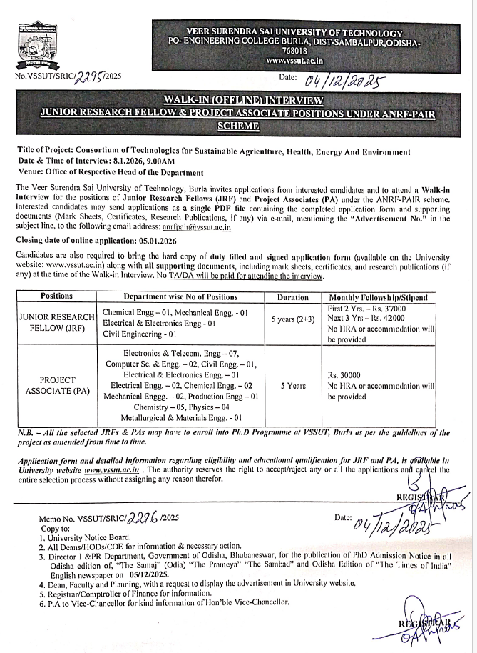 Veer Surendra Sai University of Technology, Burla, located in Sambalpur district of Odisha, has released an official notification for the recruitment of Junior Research Fellow and Project Associate positions under the ANRF PAIR Scheme. The recruitment is being conducted through a walk-in offline interview process